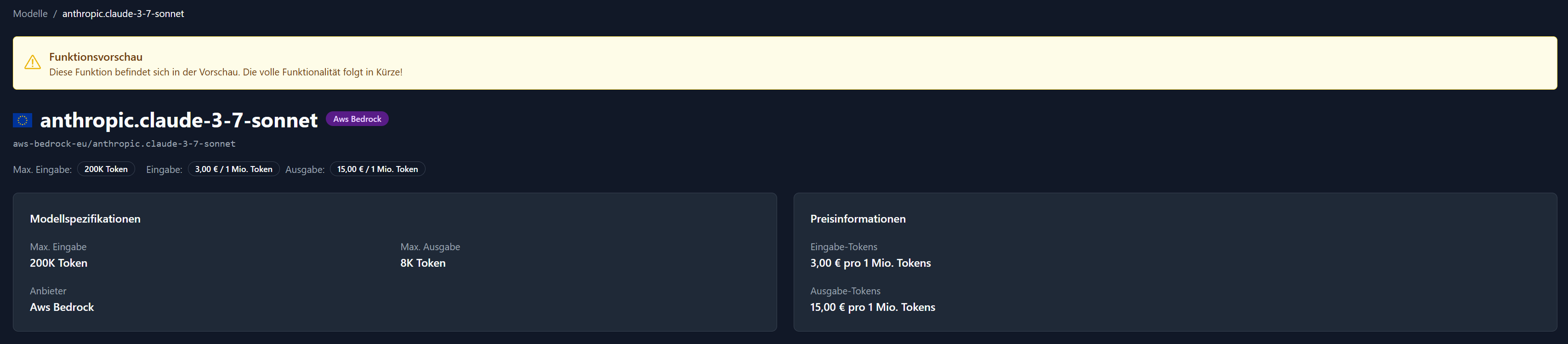 anthropic.claude-3-7-sonnet) und dessen Anbieter (z. B. AWS Bedrock). - Endpoint: Gibt die API‑Endpunktadresse für das Modell an.