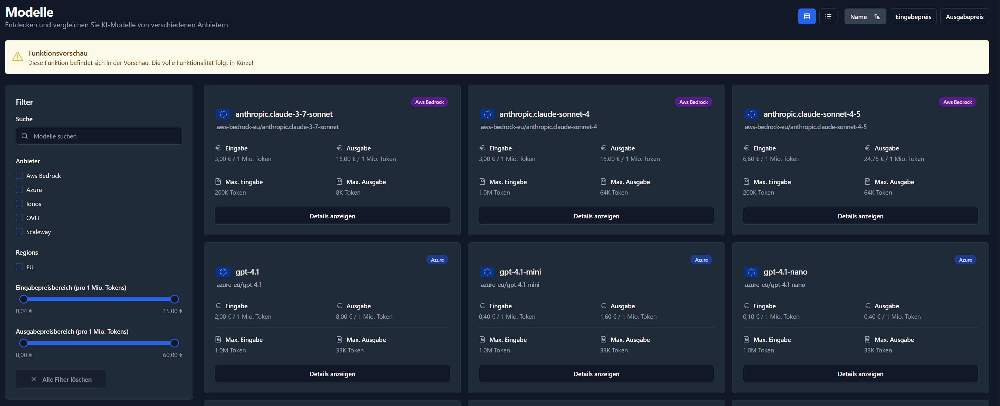 - Modellkarten: Jede Karte zeigt den Modellnamen, den Anbieter, den Preis pro 1 M Token (Eingabe/Ausgabe), die maximale Tokenanzahl und einen Link zu weiteren Details.