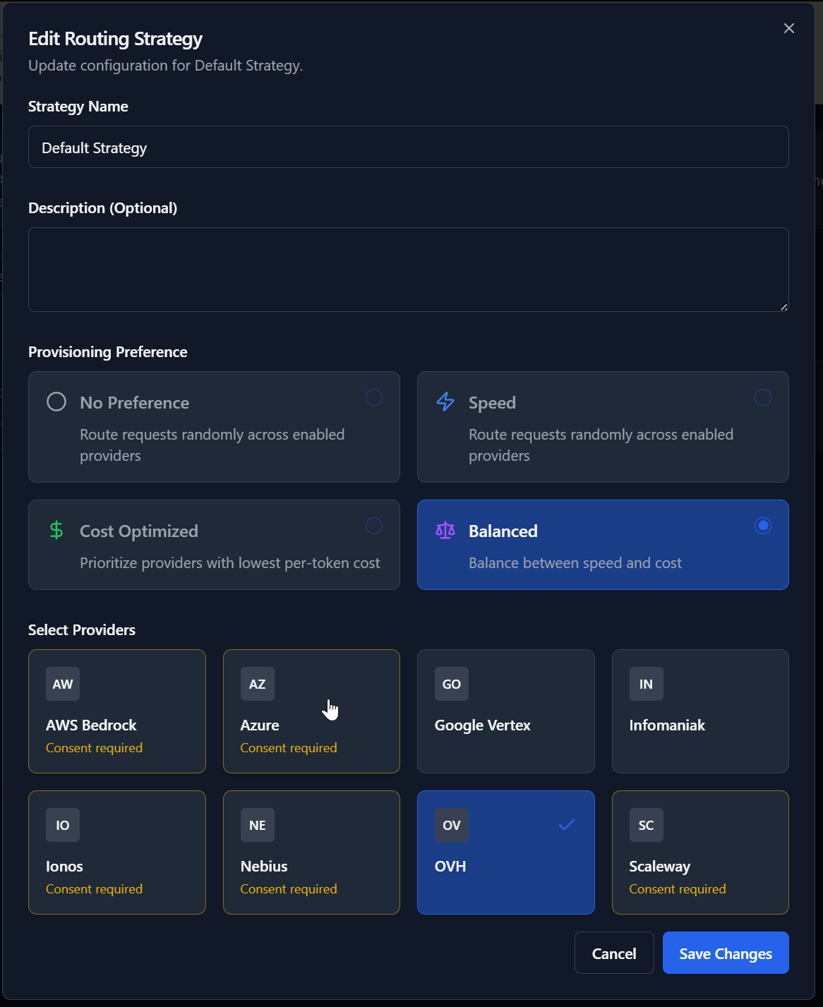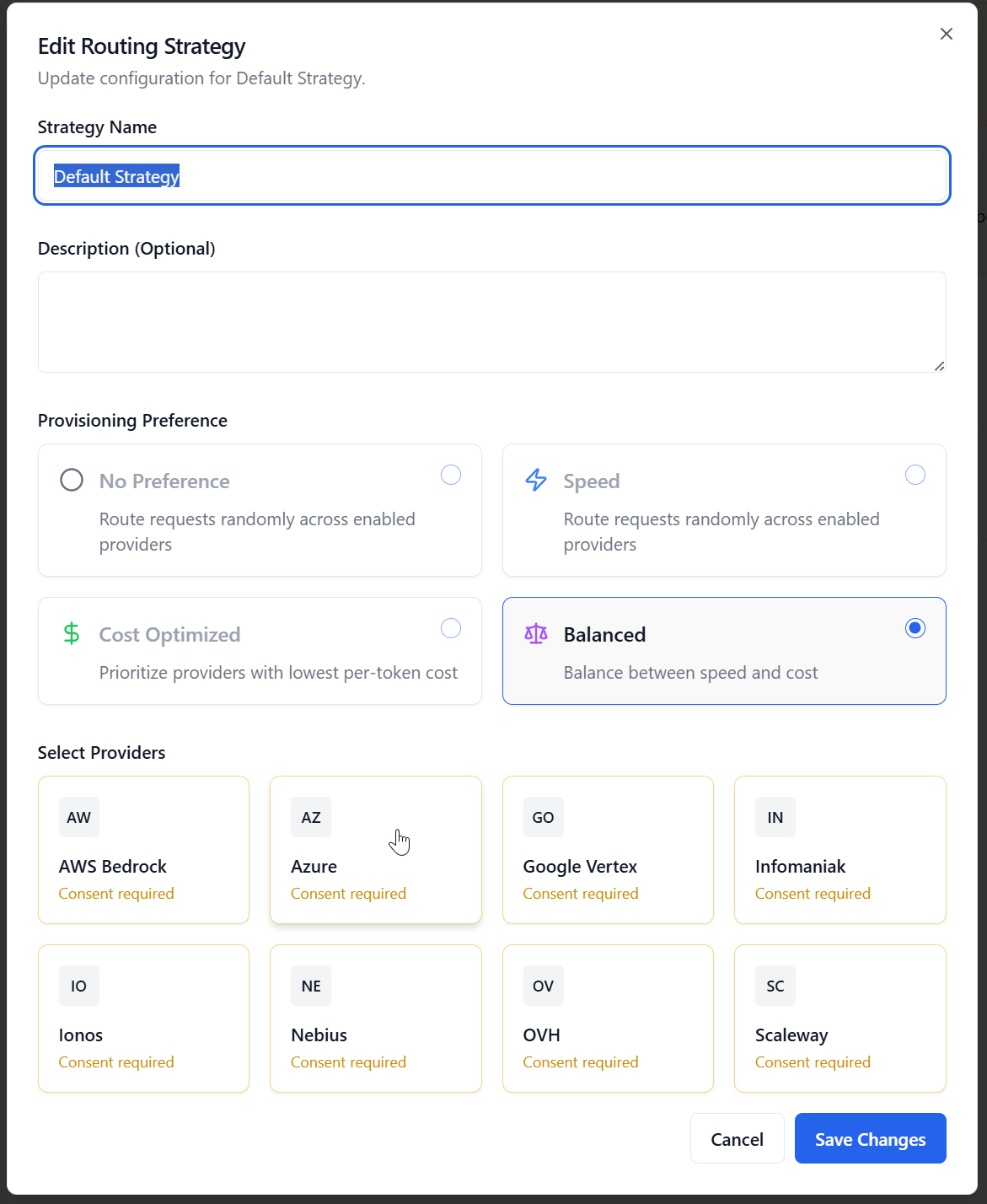 Manage and configure routing strategies to control how requests are directed to different LLM providers based on a defined provisioning preference and provider assignment.