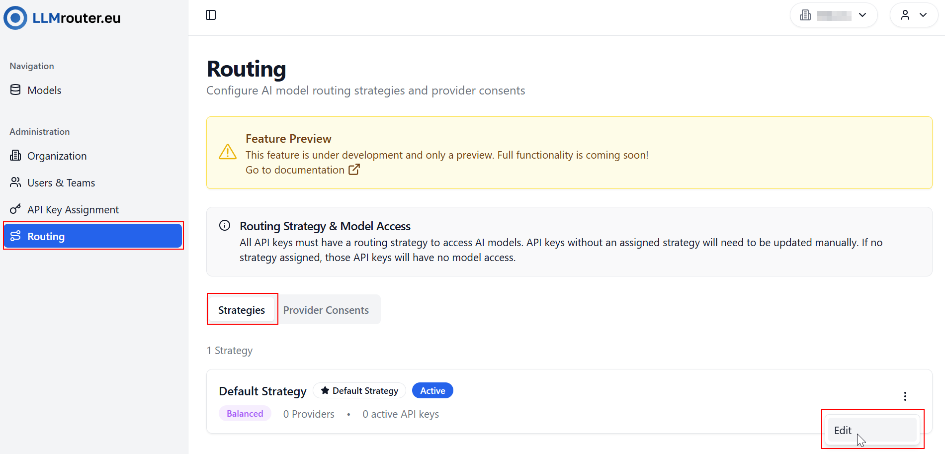 When you first navigate to the "Strategies" tab, you will see the default routing strategy created for your organization. The initial routing strategy will have no providers assigned, i.e. it will not route any requests until configured. To configure the strategy, you need to edit it and assign providers.