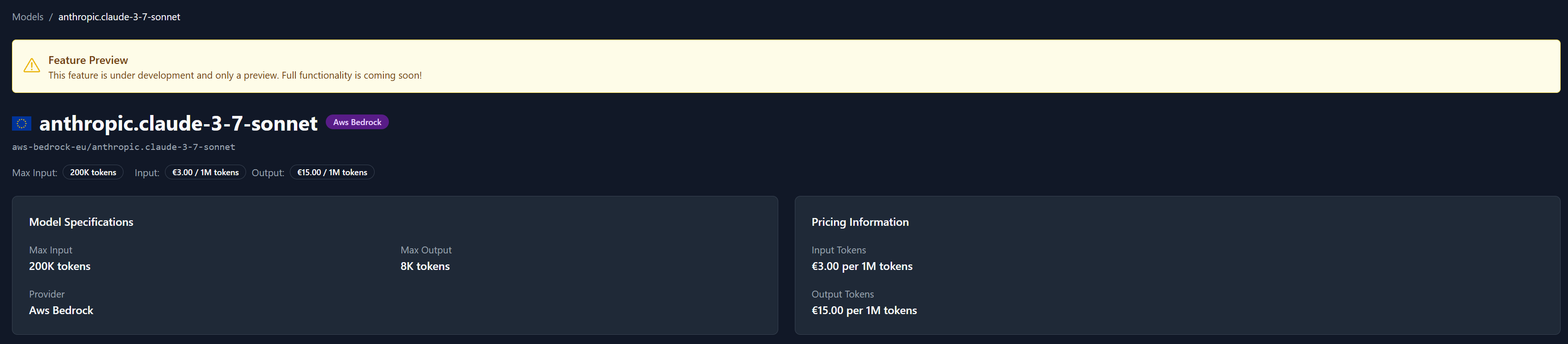 - Pricing: Transparent cost per 1M input and output tokens (e.g., €3.00 / 1M input tokens, €15.00 / 1M output tokens).