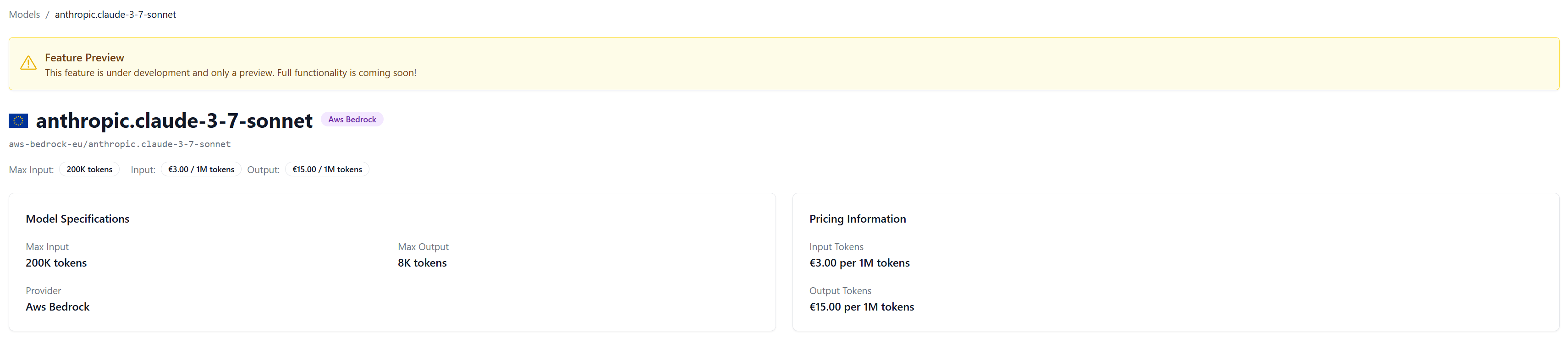 anthropic.claude-3-7-sonnet) and its provider (e.g., AWS Bedrock). - Endpoint: Shows the API endpoint for the model.
